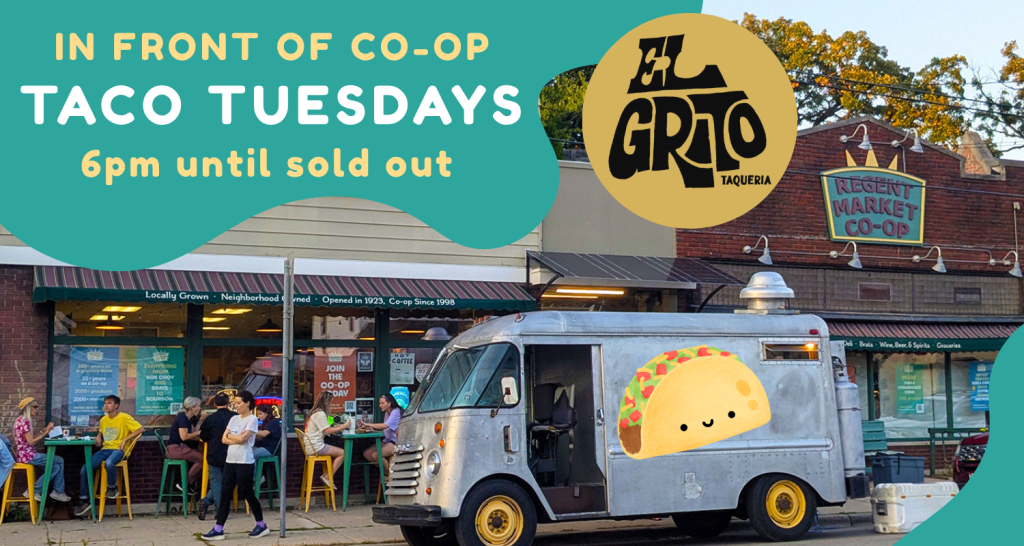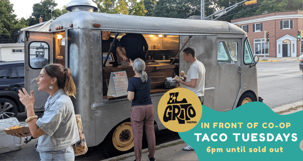 Yep, it’s eating-tacos-on-the-sidewalk-in-front-of-the-Co-op season again! Head over Tuesday evenings for El Grito’s great grub. Their food truck will be parked in front—6pm until they sell out (weather permitting). Pair your tacos with one of the Co-op’s many drink offerings, from on-tap beers and kombucha, to a fridge full of soda/bubbly water/and more.